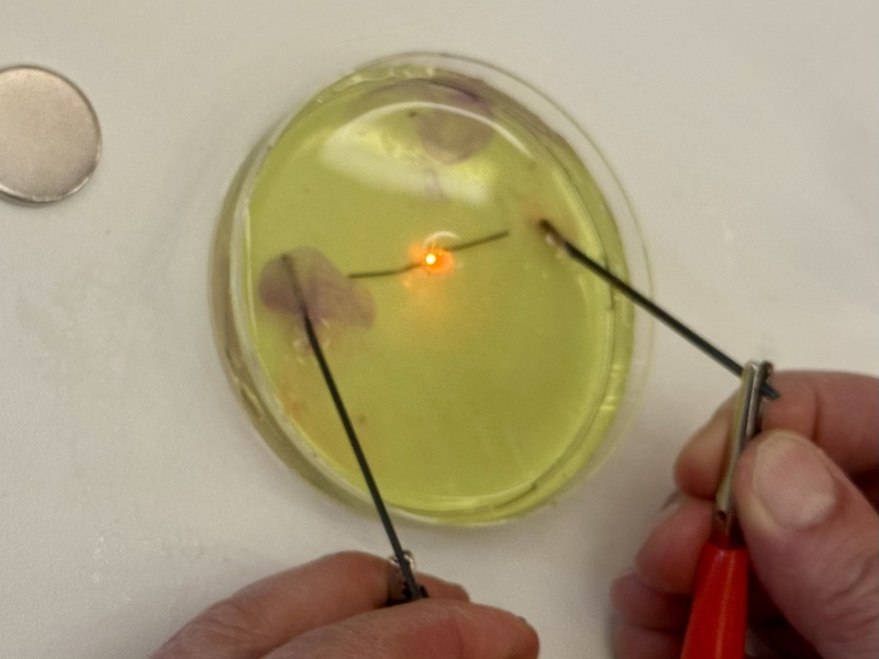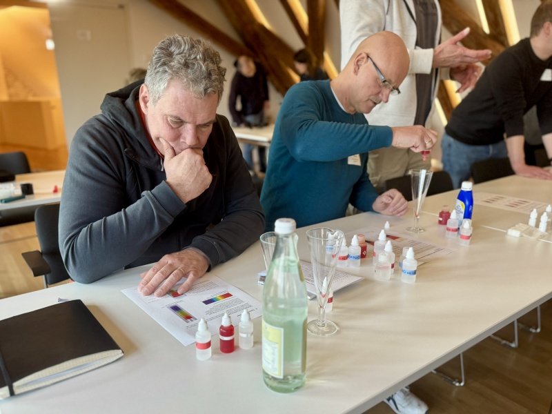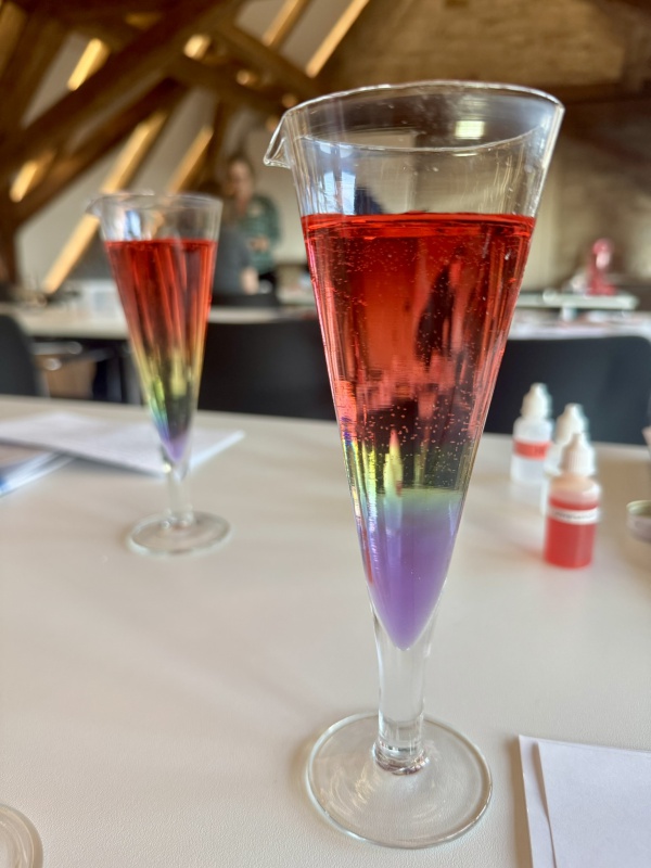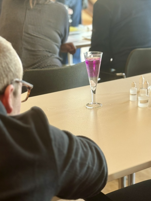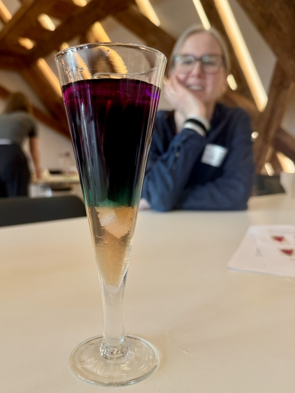 Die Teilnehmenden stellten Calciumalginat-Bällchen her, die mithilfe verschiedener Sirupe individuell gefärbt und aromatisiert wurden. Die entstandenen „Perlen“ wurden anschließend in Sekt gegeben – ein ebenso anschauliches wie genussvolles Beispiel für Chemie zum Mitmachen.